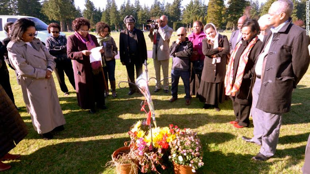 | Des membres de la communauté éthiopienne de Seattle se sont rassemblés autour de la tombe de Hana Williams le 29 octobre 2013, quelques heures après la condamnation de Larry et Carri Williams. |