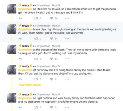 Le diplômé a dit que ses parents étaient choqués que l’école ait appelé la police pour le virer de la cérémonie, ajoutant qu’il a été accueilli avec un mélange de réactions positives et négatives sur Twitter.